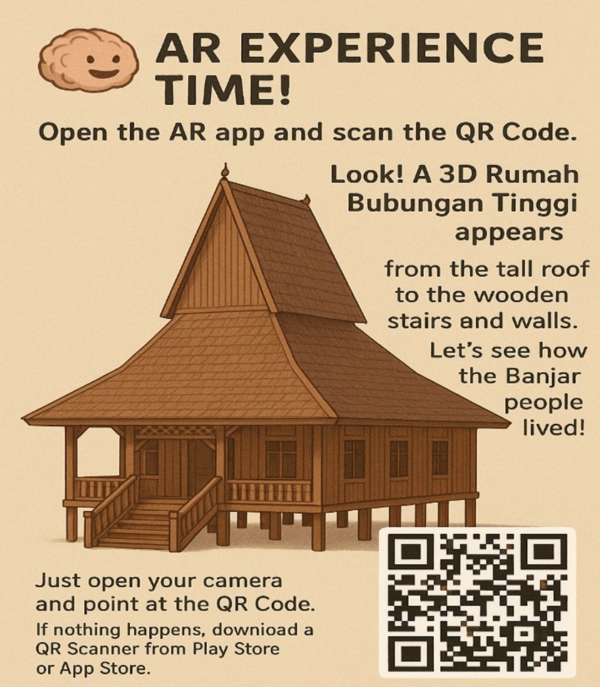 E-book ini dirancang untuk mengenalkan kearifan lokal Kalimantan Selatan kepada generasi muda sejak dini. Melalui pendekatan bilingual (Bahasa Inggris dan Bahasa Indonesia) serta dukungan teknologi Augmented Reality (AR), anak-anak tidak hanya membaca dan melihat gambar, tetapi juga berinteraksi secara langsung dengan budaya lokal melalui animasi 3D, suara, dan permainan edukatif.